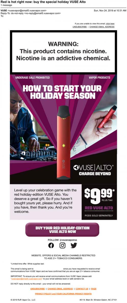 Email from Vuse in November 2019 promoting a special "red holiday edition" Alto device, now for sale.