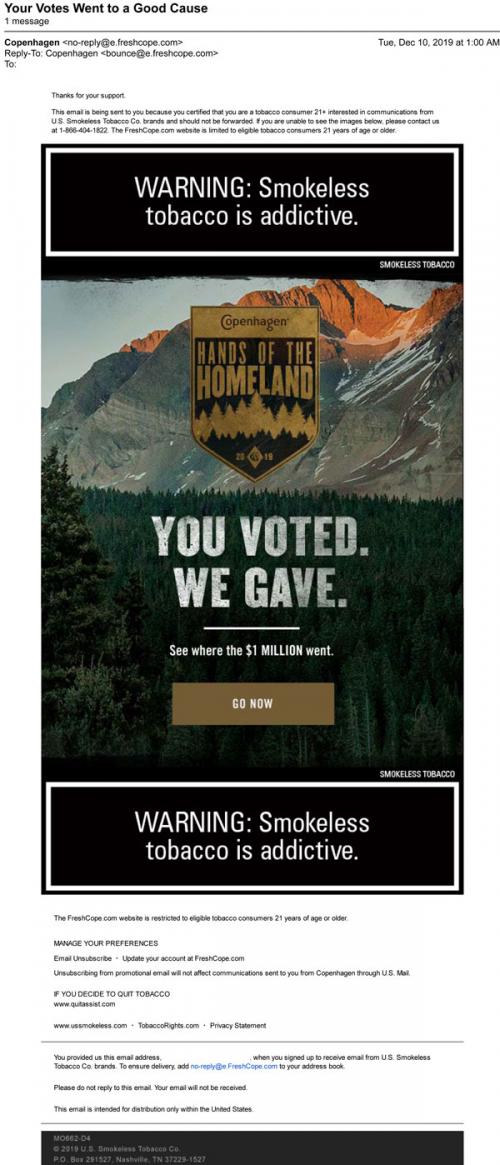 Email from Copenhagen in December 2019 announcing the reveal of the final donation recipients for their Hands of the Homeland project, with a link to the brand website to learn more.