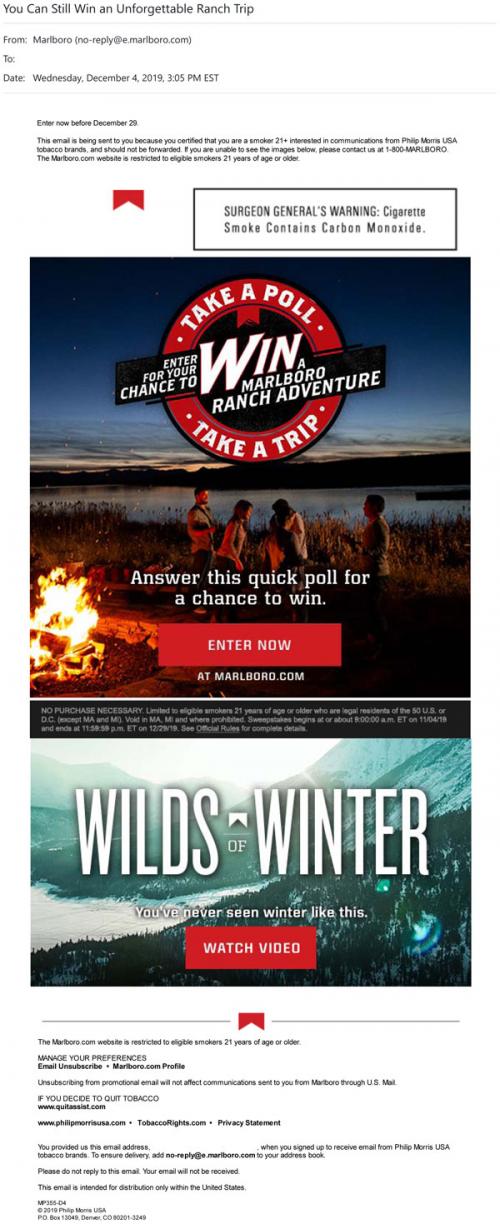 Email from Marlboro in December 2019 with a link to enter for a chance to win a trip to the Ranch. Also includes a link to watch a winter wilderness video.