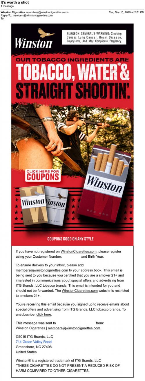 Email from Winston in December 2019 with a claim that their tobacco ingredients are "tobacco, water & straight shootin'." Includes a link to claim coupons.