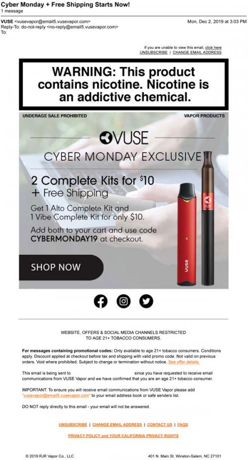 Email from Vuse in December 2019 with a Cyber Monday deal that customers can access with the included promo code through the brand website.
