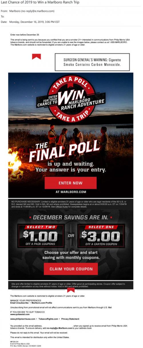 Email from Marlboro in December 2019 promoting the last chance to win a Ranch trip by voting in a poll on the brand website. Also provides a link to claim coupons.