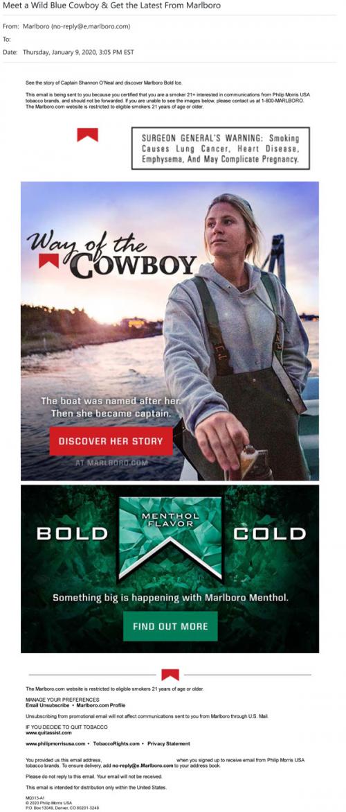 Email from Marlboro in January 2020 providing a link to see a new story on Way of the Cowboy and learn more about a new menthol product.