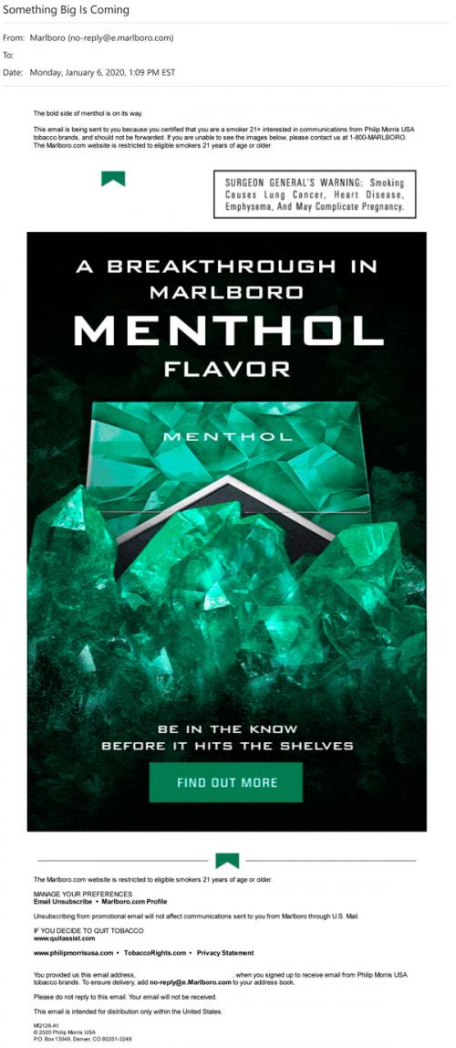 Email from Marlboro in January 2020 promoting a new menthol product. Links to the brand website to learn more.