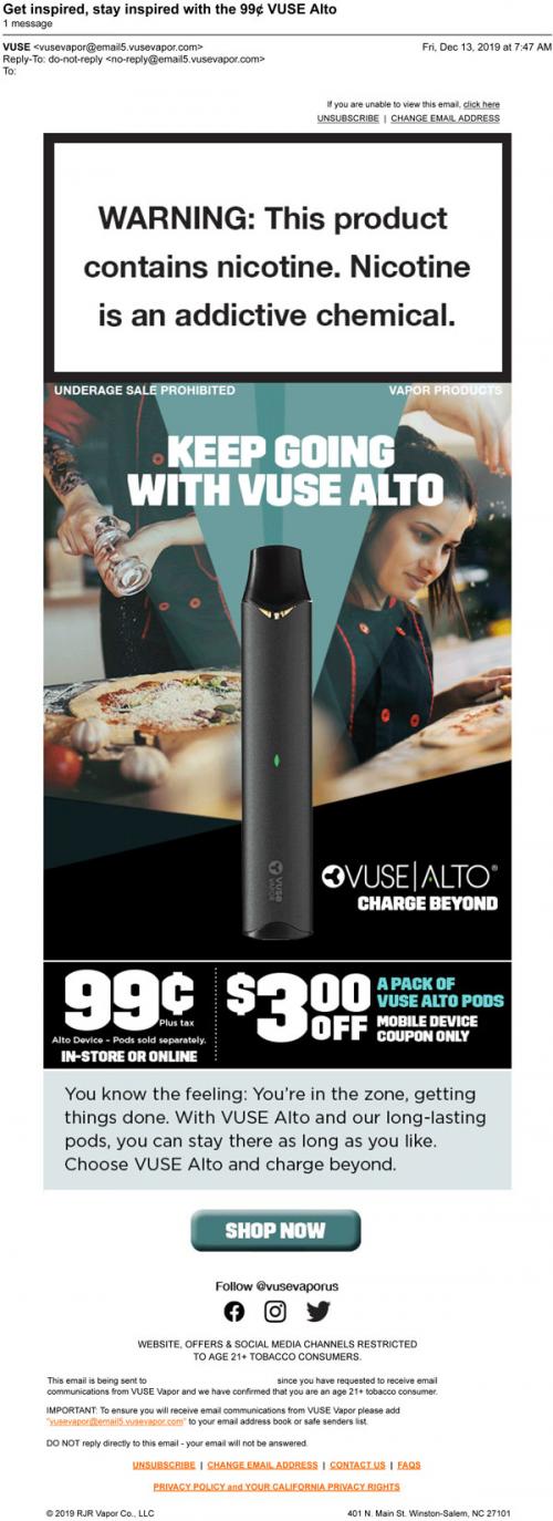 Email from Vuse in December 2019 promoting their Alto device with a reduced price offer and a mobile coupon for pods.