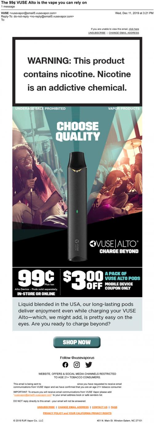 Email from Vuse in December 2019 promoting the Alto device for a discounted price, and mobile coupons available to claim.