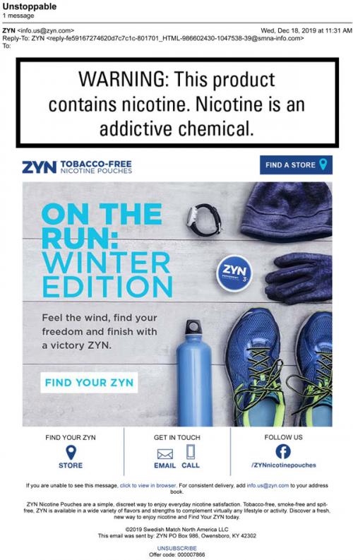 ZYN email in December 2019 with a reminder to use their products during winter runs. Provides links to use a store locator and follow the brand on Facebook.