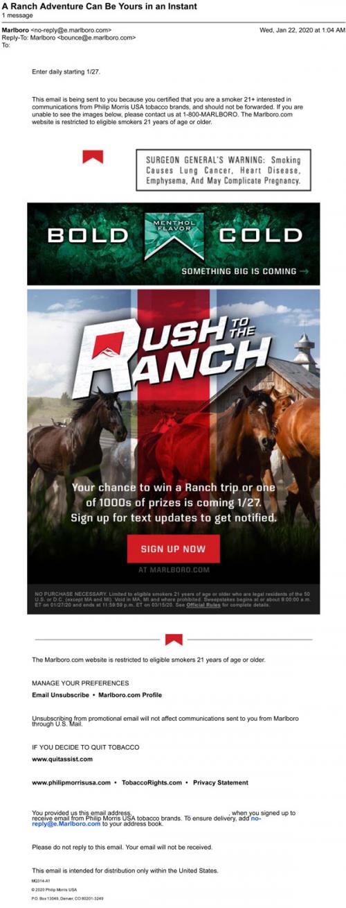 Email from Marlboro in January 2020 announcing the Rush to the Ranch, a new chance to win a Ranch trip, with the option of signing up for mobile text alerts from the brand. Also promotes their upcoming new "Bold Cold" menthol product.