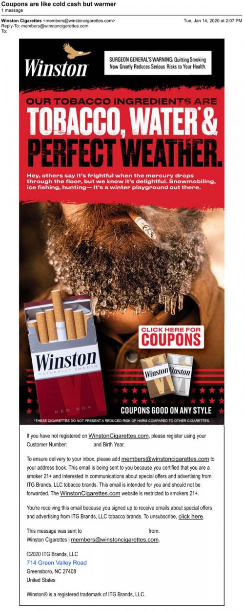 Email from Winston in January 2020 celebrating cold weather activities with their tobacco ingredients claim: "tobacco, water & perfect weather." Provides a link to claim coupons from the brand website.