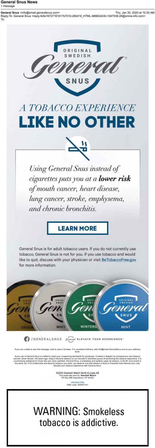 Email from General Snus in January 2020 with the new harm reduction claim the brand is allowed to make after FDA approval. Provides a link to the brand website to learn more. Text: "Using General Snus instead of cigarettes puts you at a lower risk of mouth cancer, heart disease, lung cancer, stroke, emphysema, and chronic bronchitis."