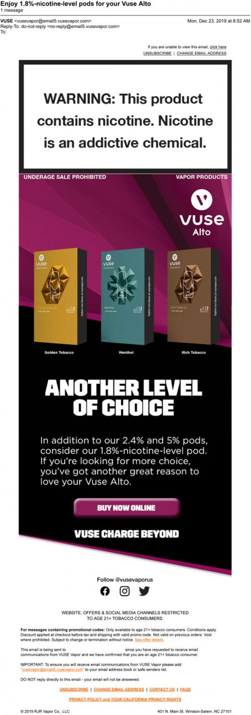 Email from Vuse in December 2019 promoting a new 1.8% nicotine level pod for their Alto device, with a link to purchase online.