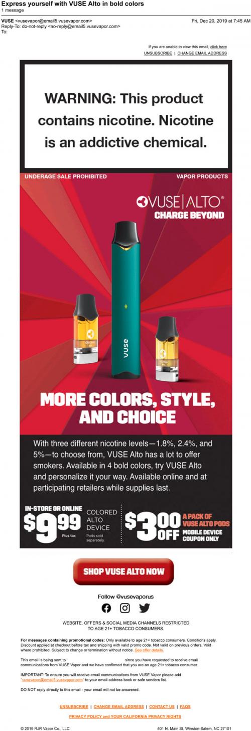 Email from Vuse in December 2019 promoting new colors and nicotine levels for their Alto device. Supplies promotional device price and a mobile coupon.