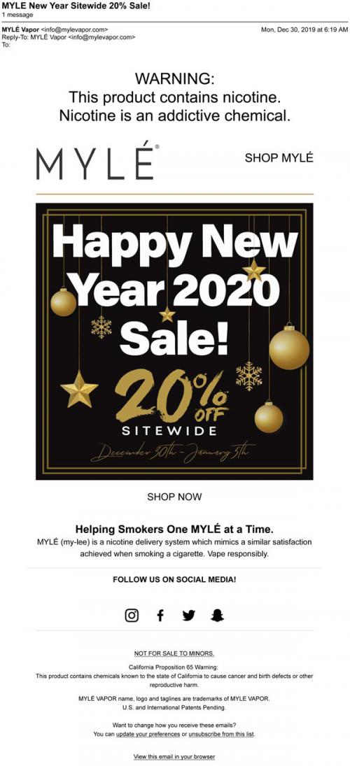 Email from MYLE in December 2019 promoting a New Year's sale through the brand website.