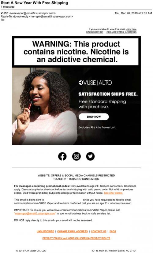 Email from Vuse in December 2019 promoting free shipping on purchases made through the brand website in celebration of the New Year.