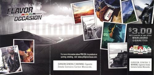 Marlboro direct mail received in December 2019 that reads "Flavor for Every Occasion" and shows several Marlboro products. Includes a coupon and instructions to enroll in the Rewards program on the brand website.