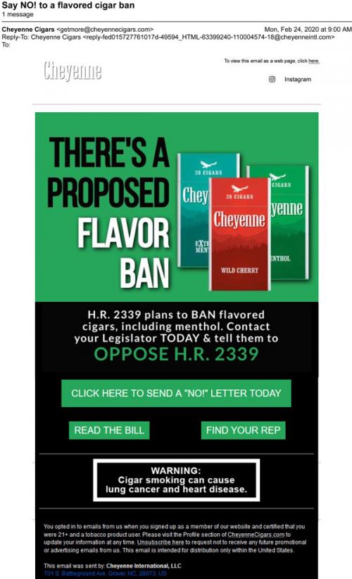 Email from Cheyenne cigars in February 2020 informing the recipient of a proposed flavor and menthol ban on cigars. Provides links to send a letter to a representative, read the bill, and other ways to contact legislators.