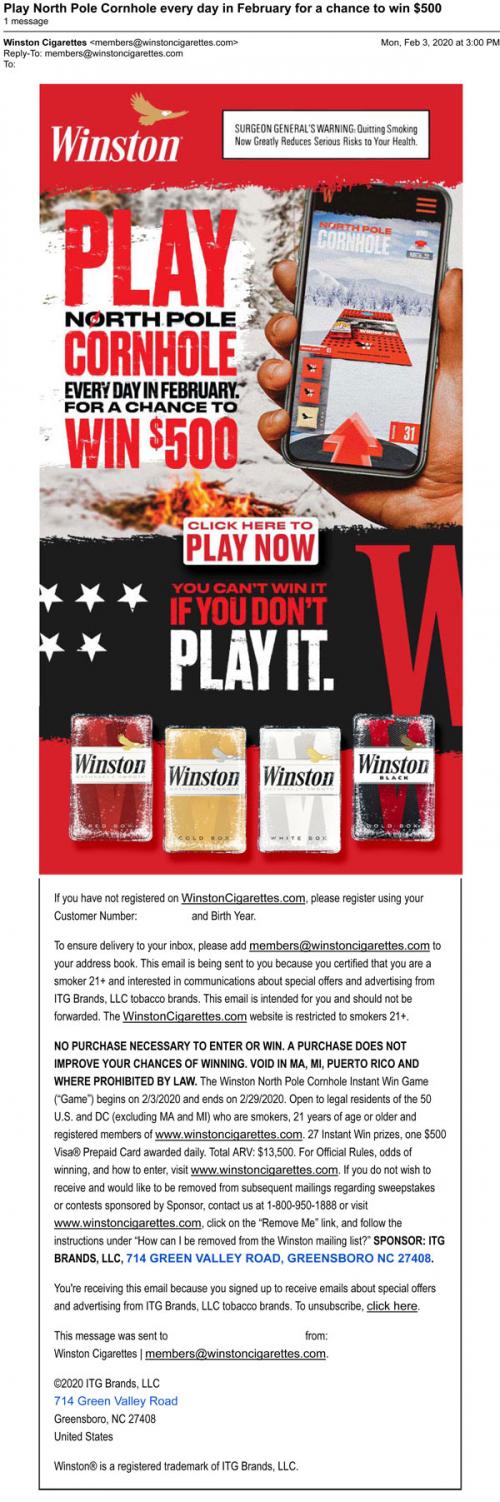 Email from Winston in February 2020 reminding the recipient to play a game of North Pole Cornhole every day on the brand website for a chance to win. Suggests the convenience of mobile access with the image of a phone.