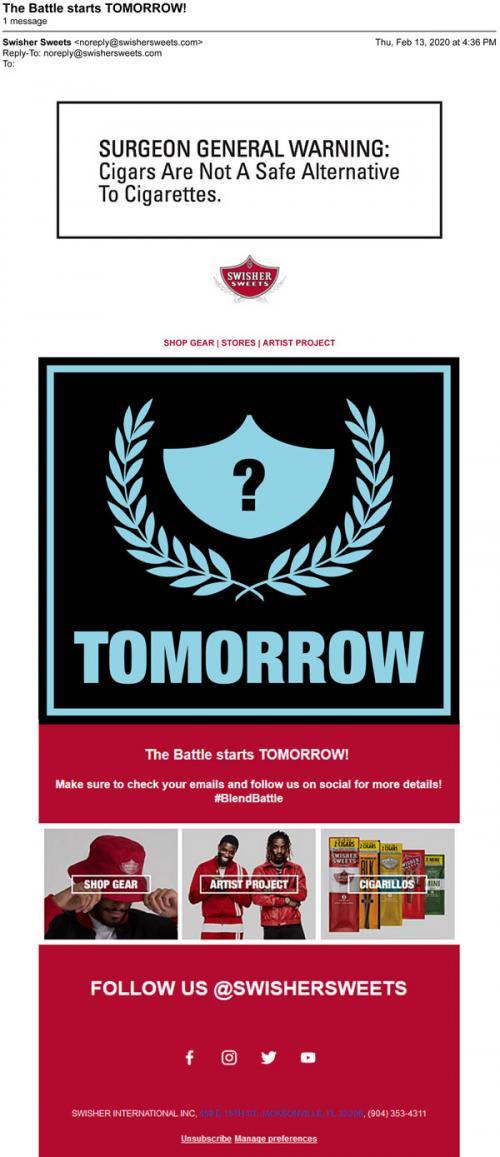 Email from Swisher in February 2020 reminding customers to follow the brand on social media and take part in the Blend Battle. Also provides links to shop and check out their styles.