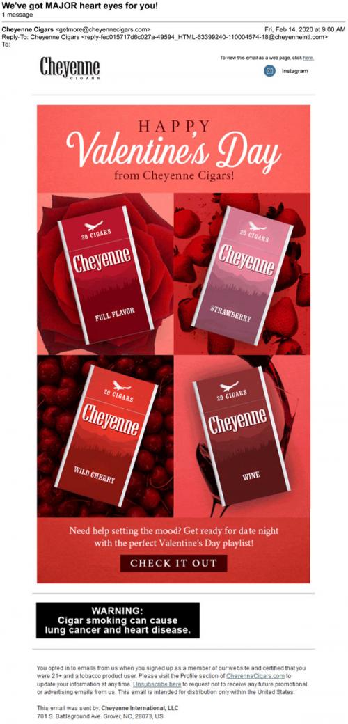 Email from Cheyenne cigars in February 2020 wishing the recipient a Happy Valentine's Day with several of their flavored packs. Also provides a link to check out a holiday playlist.