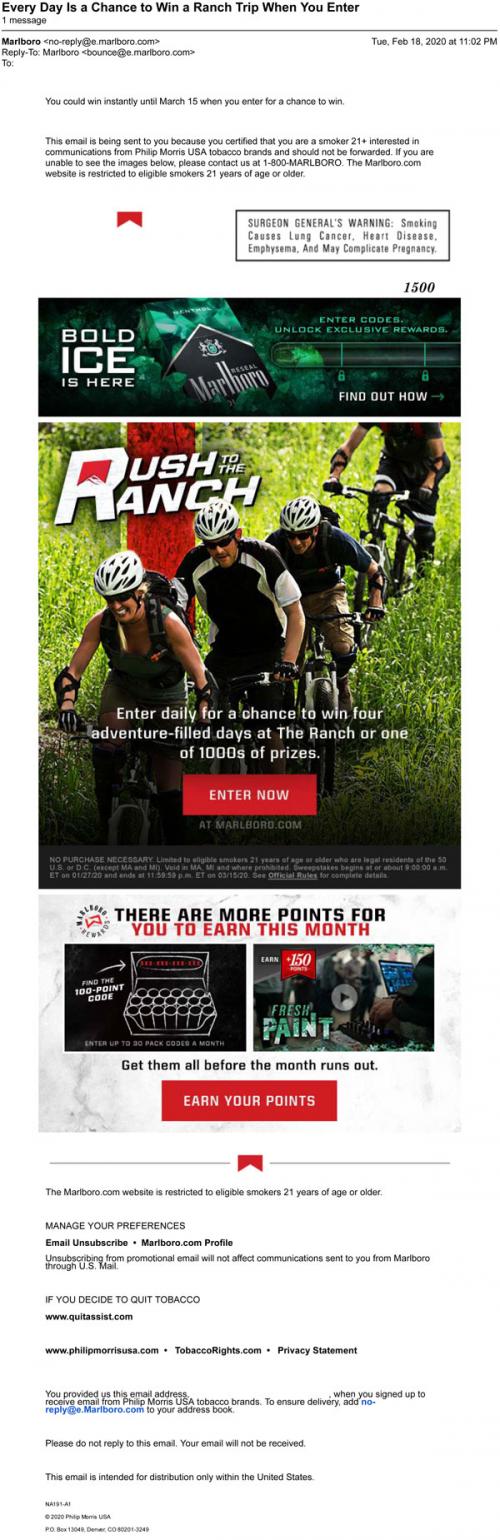 Email from Marlboro in February 2020 promoting their new Bold Ice product, with the chance to get codes for rewards points. Includes a link to enter the Rush to the Ranch sweepstakes, and to earn points in the brand's Rewards program.