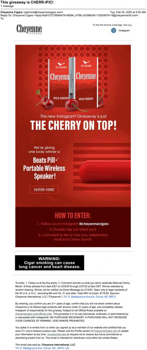 Email from Cheyenne cigars in February 2020 promoting an Instagram giveaway based on their cherry flavored cigars, with instructions on how to enter.