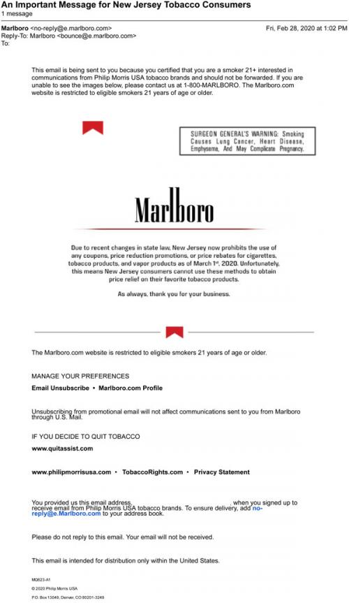 Email from Marlboro in February 2020 explaining how New Jersey law prohibits use of coupons by consumers, and thanks the recipient for their business.