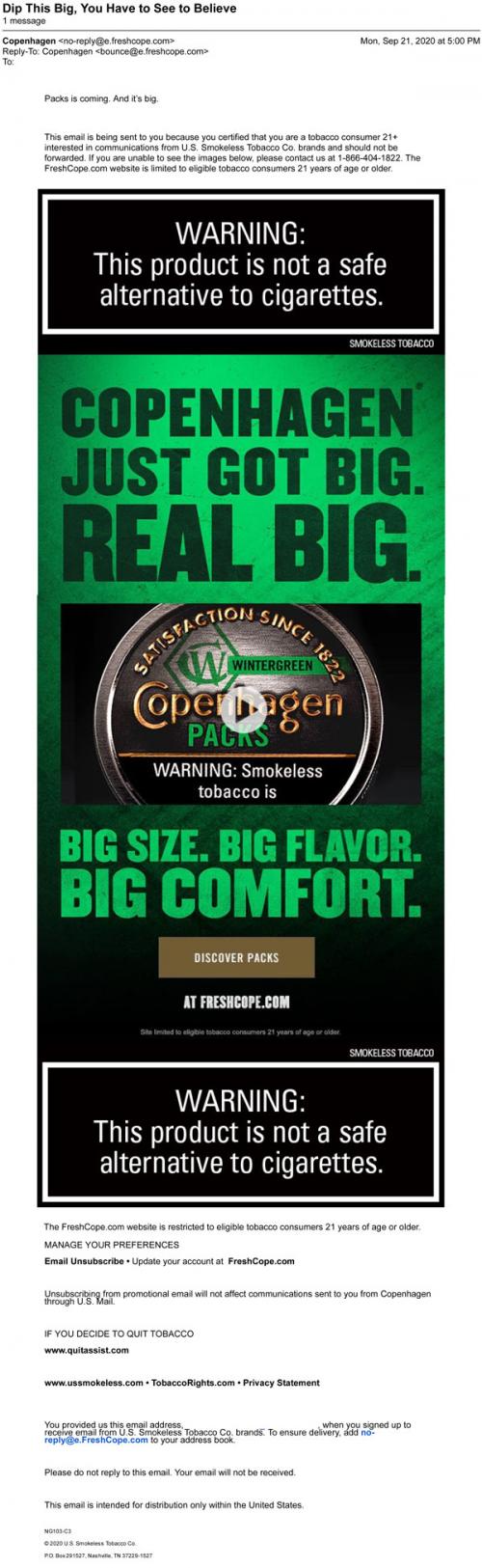 Copenhagen email from September 2020 introducing their new Wintergreen "packs" product, with a link to the brand website to learn more. The packs are like extra large pouches containing more tobacco, described as "big size, big flavor, big comfort."