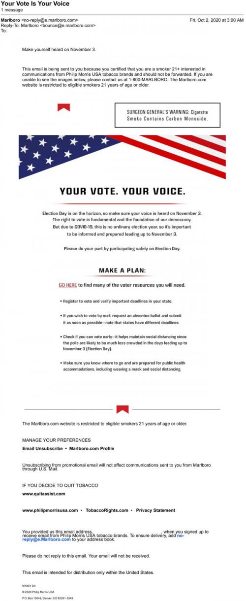 Email from Marlboro in October 2020 encouraging the recipient to vote in the upcoming election, with a reminder to keep in mind special circumstances during the COVID-19 pandemic. Provides a link to voter resources and outlines a plan to observe proper social distancing procedures.