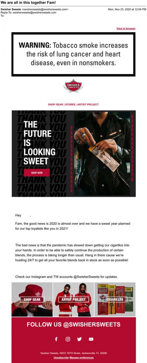 An email from Swisher Sweets in November 2020 thanking the "fam" for hanging in there while coronavirus slows down their production of certain blends. Reminds the recipient to visit social media and the brand website to shop online.