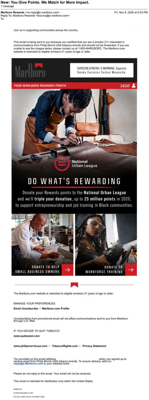Email from Marlboro in November 2020 with a new altruistic option for redeeming points in their Rewards program. Solicits the recipient to donate their Rewards points to the National Urban League, an organization that supports entrepreneurs and job training in Black communities, with an agreement that the brand will triple the donation.