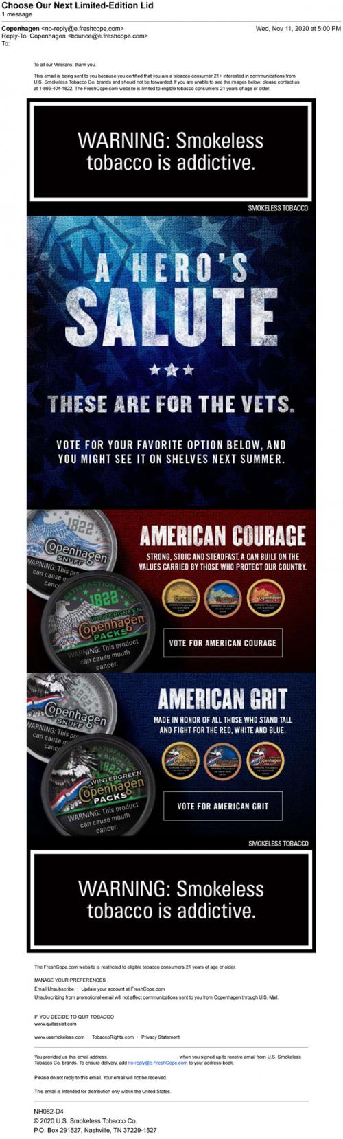 Email from Copenhagen in November 2020 with a "hero's salute" to all vets on Veteran's Day. Requests the recipient to vote for their favorite can lid designs that will be featured next summer - the choices are between "American Courage" and "American Grit," both sets feature eagles and the American flag.