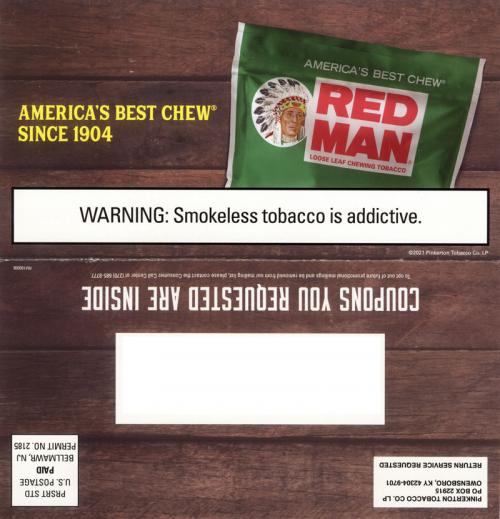 Direct mail from Red Man chewing tobacco received in April 2021offering "great savings on great flavors." Reminds the recipient to claim coupons every month on the brand website.
