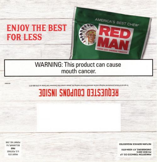 Direct mail from Red Man received in June 2021 that contains coupons and reminds the recipient to claim more coupons every month from the brand website. Text: "We discount the pouch but never the flavor."