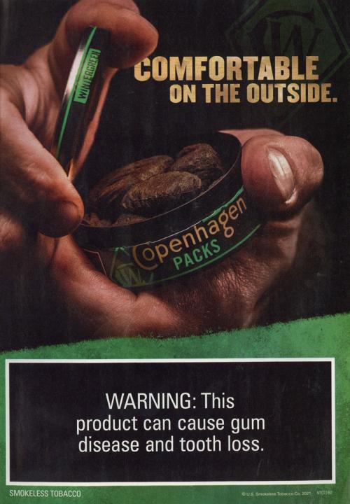 Ad promoting Copenhagen's wintergreen packs product, available now nationwide. Has an image on the front and back of the page with hands holding a can and stretching a pouch. Text: "Comfortable on the outside. Copenhagen on the inside."