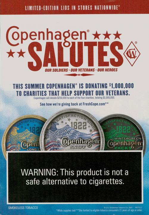 Copenhagen ad saluting veterans and soldiers and announcing a donation campaign.The ad also announces limited-edition lids that have eagle and American flag designs. Invites the viewer to visit the brand website and learn more.
