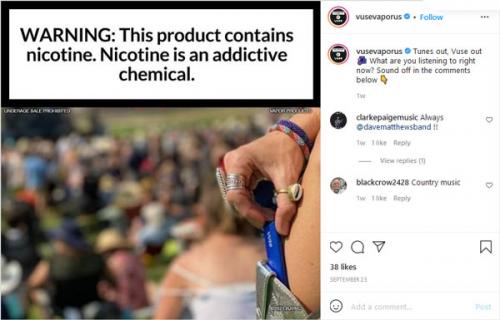 Instagram post made by Vuse in September 2021 that hints at using their product at outdoor festivals. A woman in the foreground is slipping the device into her jeans waistband.