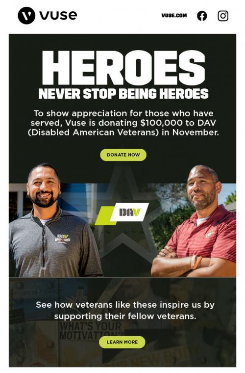 Screenshots from Vuse's website and Instagram account showing their initiative to donate $100,000 to the Disabled American Veterans organization. Two "Veteran Heroes" were featured on the brand's Instagram.