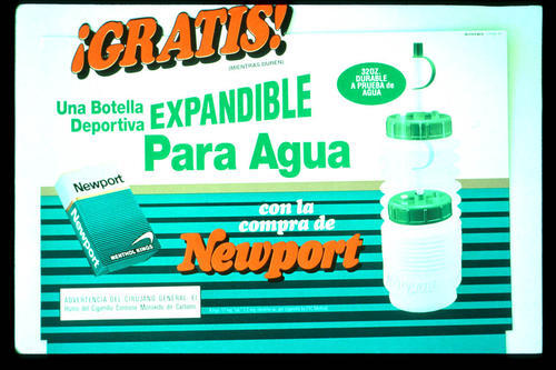Countertop display signs in Spanish offering a water bottle for Newport.