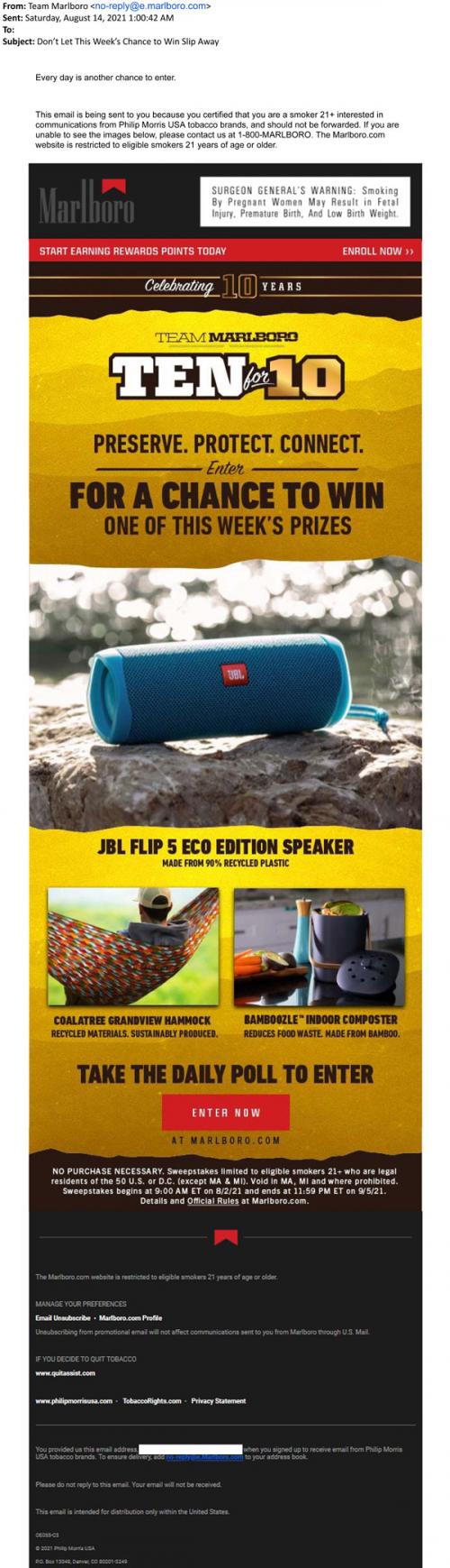 Email from Marlboro in August 2021 promoting the Ten for 10 sweepstakes, honoring Team Marlboro's 10th anniversary. Contains pictures of possible prizes and a link to take a daily poll on the brand's website, which counts as a contest entry.