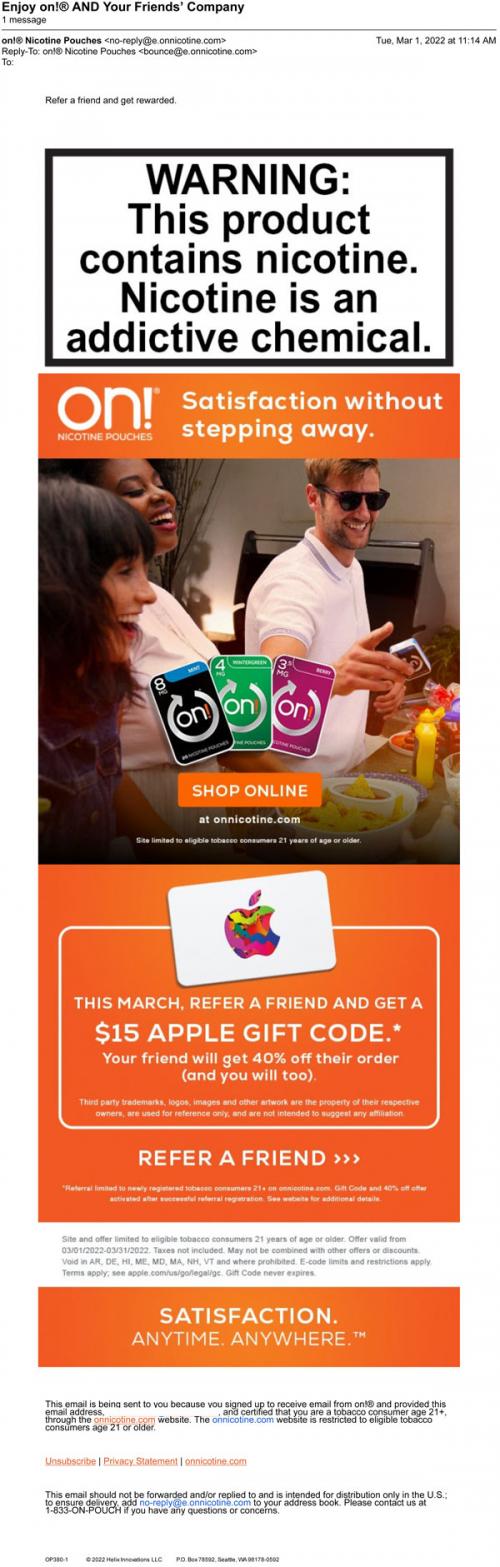 Email from on! in March 2022 promoting a 15$ Apple gift code for referring a friend to sign up on the brand website. Ad copy and imagery in the email highlights the ability to use on! nicotine pouches in social situations.