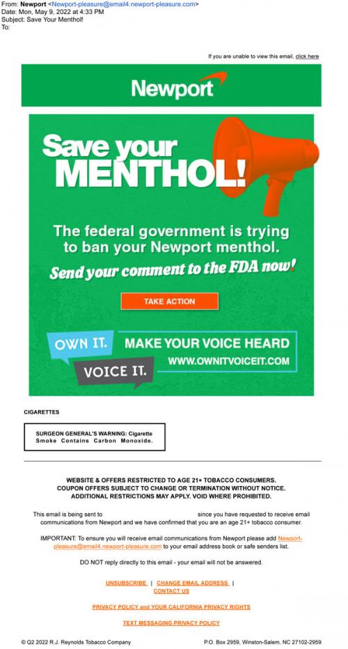 Email from Newport in May 2022 asking consumers to take action to "save your menthol" by making a comment through the Own It, Voice It website run by Reynolds American.
