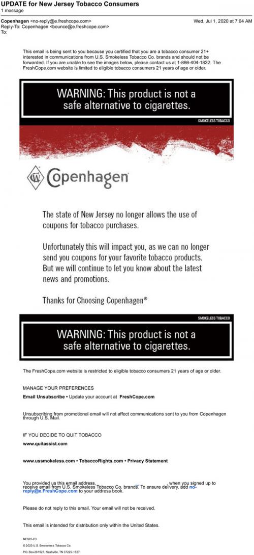 An e-mail from Copenhagen July 2020, updating the consumer on the legislation of the state of New Jersey which no longer allows coupons for tobacco purchases. The brand informs the recipient Copenhagen will keep the customers updated on any news and promotions.