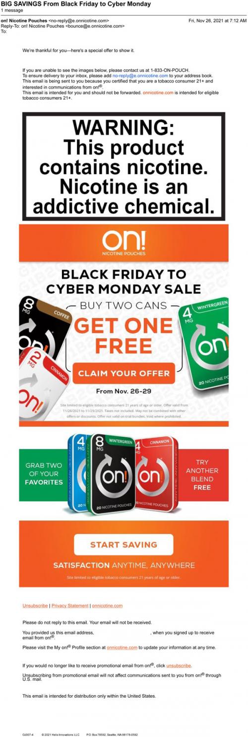 An e-mail from On! November 2021, offering "big savings" to the customer in the brand's Black Friday to Cyber Monday Sale. The brand urges the recipient to claim offer of "buy two cans, get one free." Displays different flavors of nicotine pouches available as well as the text to the customer to grab your two favorites and try another blend for free. Describes On! products as satisfaction anytime, anywhere.