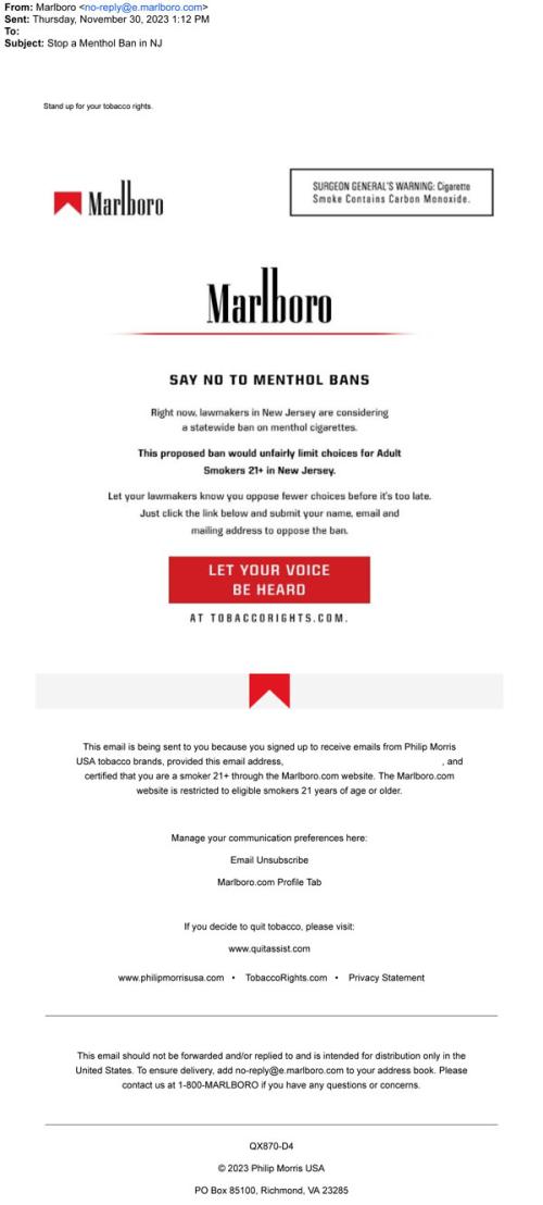 Email from Marlboro in November 2023 asking consumers to contact state representatives to oppose a menthol ban in New Jersey. The email claims that a ban would limit choices for adult smokers.
