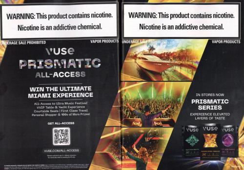 Magazine ad promoting the new Vuse Prismatic Alto pods in conjunction with a sweepstakes to win a VIP pass to the Ultra Music Festival. The new pods have a gem-like design on the box, with names like Aqua Frost Menthol, Golden Spark, and Dusk Glow Tobacco. Includes a QR code to enter the sweepstakes on the brand website.