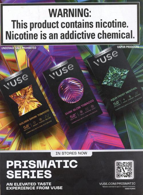 Magazine ad promoting the new Vuse Prismatic series of pods meant to use with the Alto e-cig device. The packs feature colorful crystals and flavor names like Golden Spark, Dusk Glow, and Aqua Frost. Includes a QR code to visit the brand website. Text: "An elevated taste experience from Vuse"