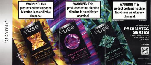 Two-sided, fold-out magazine ad that promotes the Vuse Prismatic Series pods, which are advertised as now available in stores. Also promotes the associated sweepstakes to win "the ultimate Miami experience." Includes QR codes to enter the sweepstakes and learn more about the product.