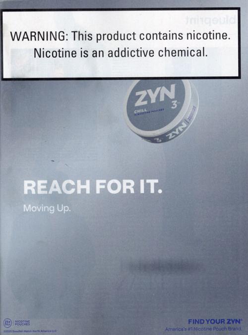 Zyn magazine ad featuring a can of Chill flavor and a monochrome color scheme, with the text "Reach for it. Moving Up."