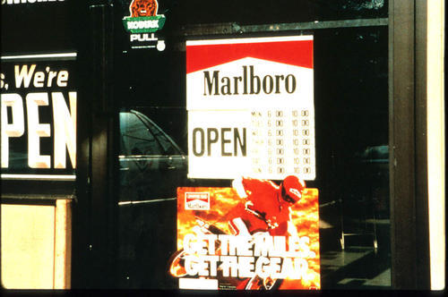 Marlboro door display of store hours. "Get the miles - Get the Gear" featured below.
