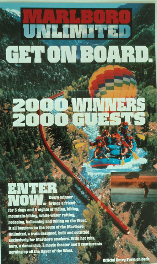 Marlboro Unlimited Sweepstakes entry. Similar sweepstakes promotions continue to be run by Philip Morris and RJ Reynolds. Sweepstakes help build mailing lists. "Marlboro Unlimited - Get on Board - 2000 Winners - 2000 Guests" "Every winner brings a friend for 5 days and 5 nights of riding, hiking, mountain biking, white-water rafting, rodeoing, ballooning and taking on the West. It all happens on the route of the Marlboro Unlimited, a train designed, built and outfitted exclusively for Marlboro smokers. With hot tubs, bars, a dance club, movie theater and 2 restaurants serving up all the flavor of the West."